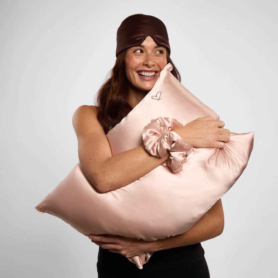 Set includes: Satin Pillowcase Standard - Blush Satin Pillow Scrunhie - Blush Satin Pillow Eye Mask - Chocolate.